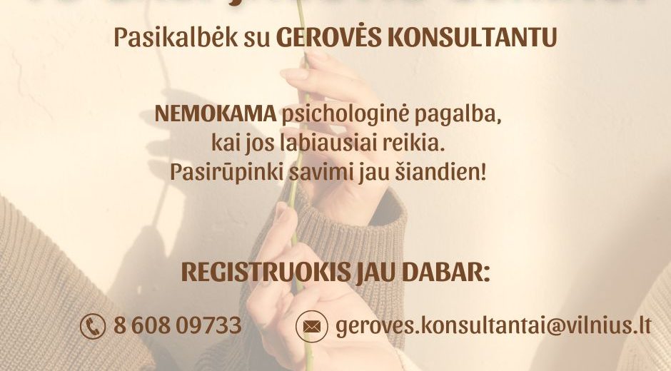 Informuojame apie Gerovės konsultantų paslaugas Vilniuje (https://www.geroveskonsultantai.lt/Gerov-s-konsultantai/). Gerovės konsultantų paslaugos yra nemokamos, jomis gali naudotis asmenys nuo 18 metų amžiaus. Projektas vykdomas 14-oje Lietuvos savivaldybių.